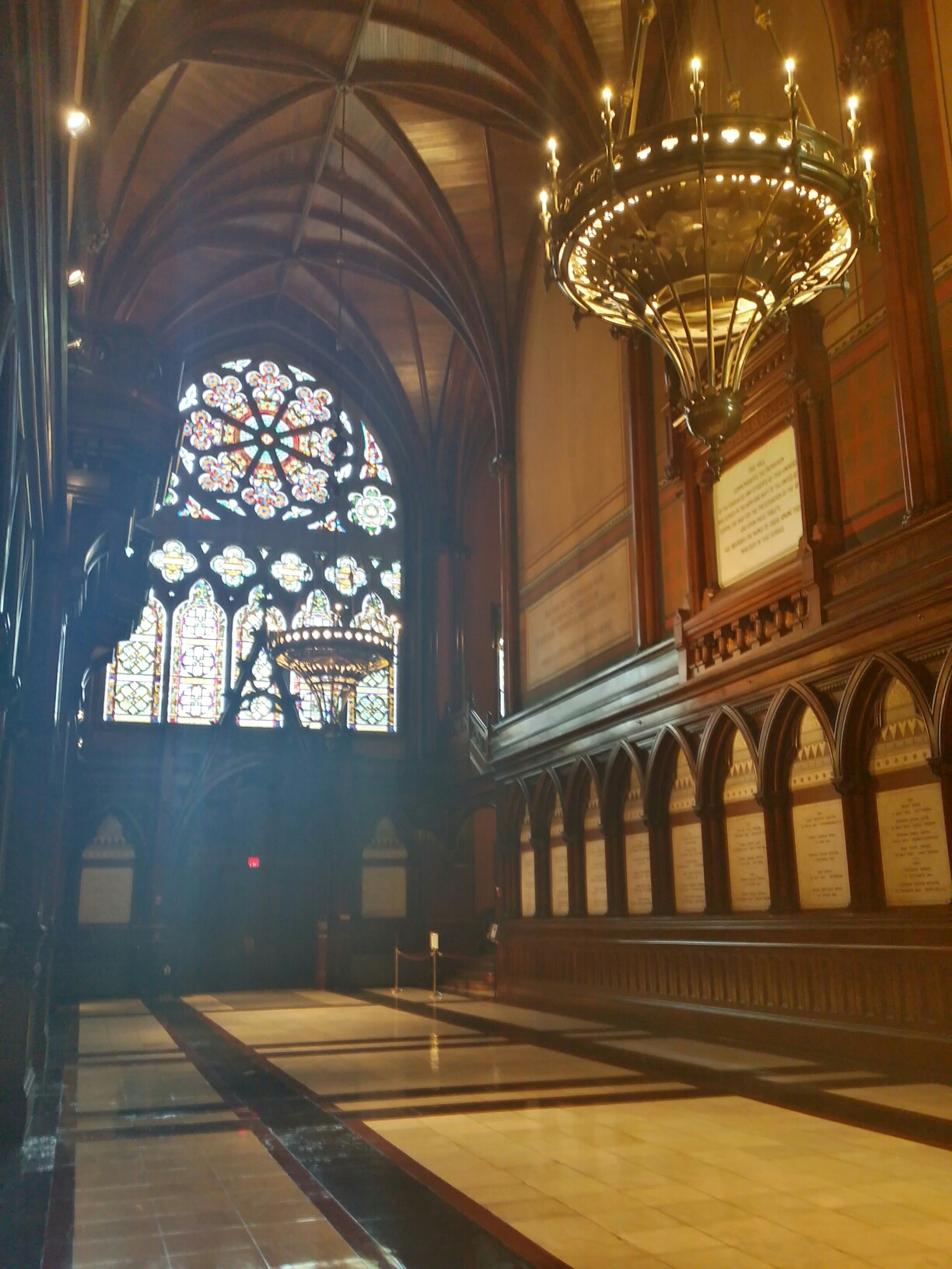 Just separated by a dark walnut wood wall from Annenberg Hall, the memorial transept presents a beautiful world of art. This memorial space boasts a 2,600 square foot marble floor, a sixty foot high wooden gothic vault, two stained glass windows spanning 708 square feet each, black walnut paneling, stenciled walls and 28 white marble tablets bearing the names of 136 Harvard associates who fell on behalf of the Union cause during the Civil War. The youngest, Sumner Paine, class of 1865, fell at Gettysburg on July 3, 1863, two years before his intended graduation. The Paul Joseph Revere listed is the grandson of the famous Paul Revere.