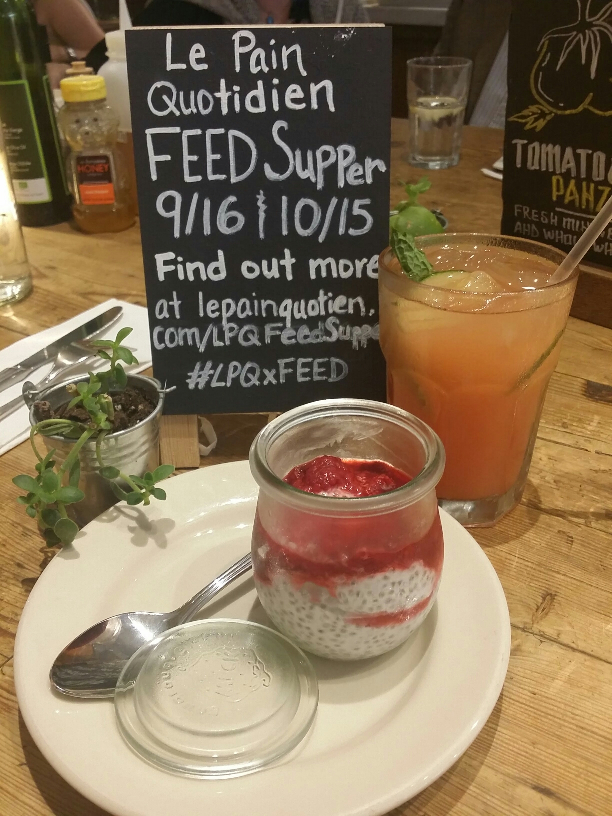 We meet up friends for a little brunch in the middle of the day at Le Pain Quotidien with raspberry chianti pudding and house special summer punch mint watermelon cucumber