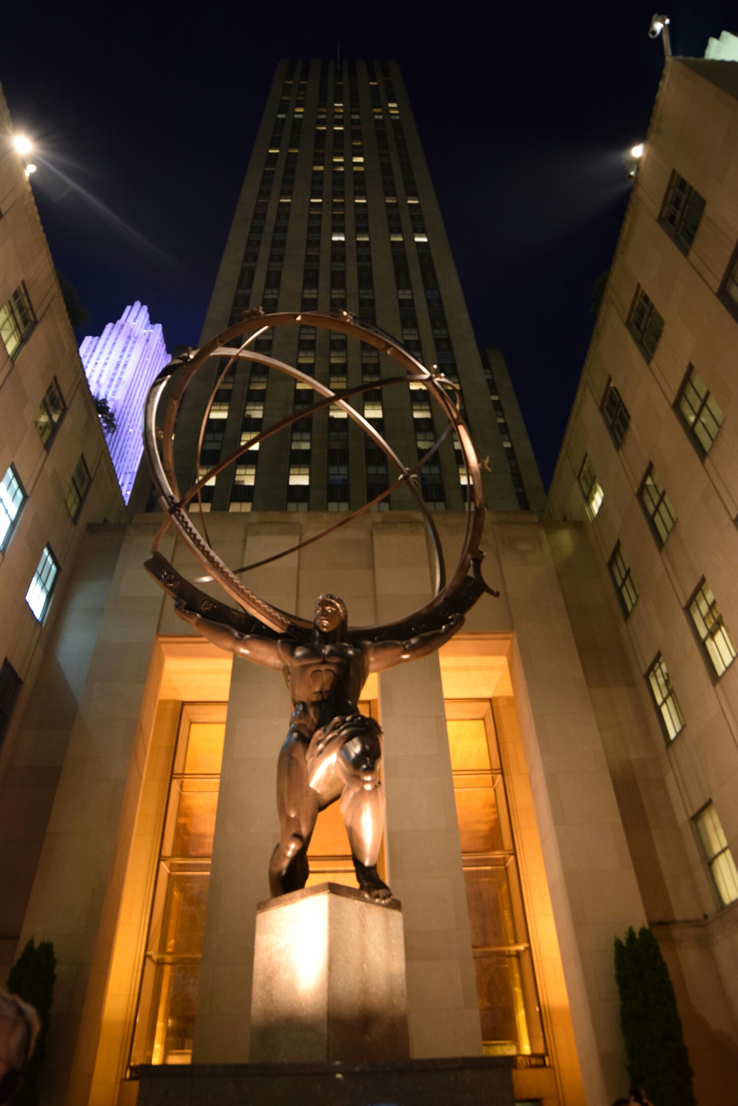 Standing prominently in front of 30 Rockefeller Plaza is Paul Manship’s highly recognizable bronze gilded statue of the Greek legend of the Titan Prometheus recumbent, bringing fire to mankind. The model for Prometheus was Leonardo (Leon) Nole, and the inscription, a paraphrase from Aeschylus, on the granite wall behind, reads: “Prometheus, teacher in every art, brought the fire that hath proved to mortals a means to mighty ends.”