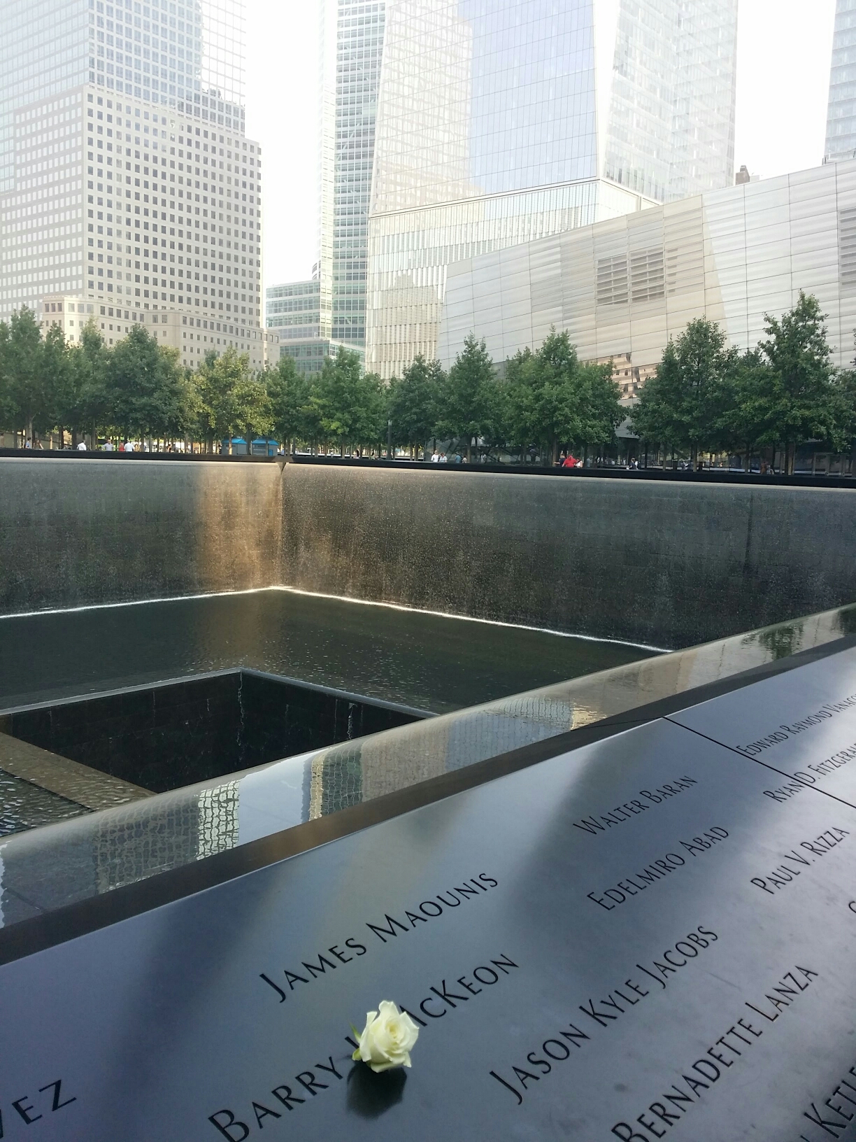 Reflecting Absence, designed by Michael Arad and Peter Walker, was chosen as the winning design on January 6, 2004. It consists of a field of trees interrupted by two large, recessed pools, the footprints of the Twin Towers. The park consists of informal clusters, clearings and groves of deciduous trees (swamp white oaks) at street level, above the Memorial Museum. The names of 2,513 civilians, 72 law enforcement officers, 343 firefighters, and 55 military personnel from the Pentagon, American Airlines Flight 77, United Airlines Flight 93, and the 1993 World Trade Center bombing are inscribed on the parapets surrounding the waterfalls in an arrangement of “meaningful adjacencies”